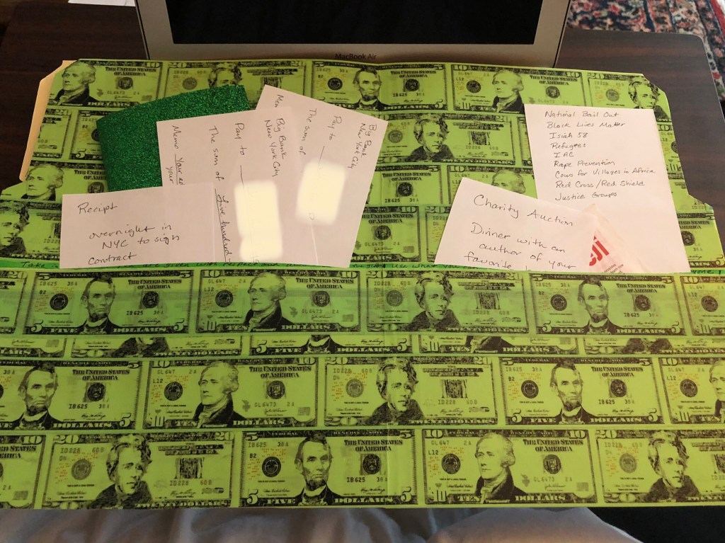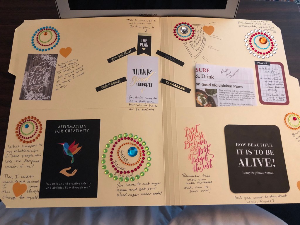 When I began figuring out where I wanted to start I chose to focus on my writing. I love to write but I want to do more with it than just amuse myself. Frankly, I don’t know how far I’ll get but I want to write something that matters to people. So I created a board out of two manilla folders I glued together. I cit a slit in them so that I created a pocket to put things in. If I had folders with pockets it might have been easier but I didn’t so I made do. I filled my writing board with things that helped me make that connection. I inserted my name into interviews about top listed books, wrote a review of my book, wrote the text for the book jacket, etc. Then I added a ‘ticket’ to an event where someone would get to sit down with me and get their questions about my latest work answered. It was not a comfortable process. I was taught not to ask for ‘too much’ or to put too high of a price on myself or my work so I couldn’t imagine these things actually happening but I know that’s the point of a vision board, to clearly, and with detail, imagine your dreams coming true so your mind starts to work towards the goal.