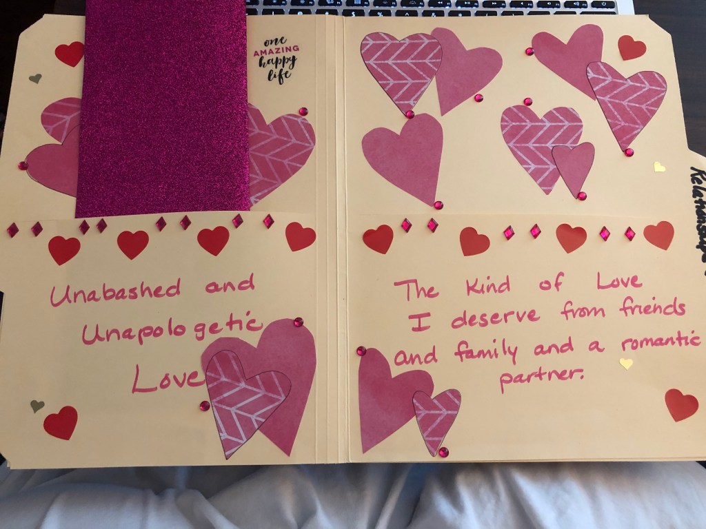 After that I did finances/money, not a hard one to spot because I found duct tape with a variety of bills on it, and wrote myself a ‘check’ from a publishing house, put in a list of charities I would donate to, and used a green sparkly piece of paper to write all the things I could do or fund once I was supporting myself with my writing. Then there was love, also not hard because I had a whole bunch of pink paper and sticky crystals. I kept this one simple, writing the kinds of things I would see, experience, feel from people who loved me on a sparkly pink page, cutting out hearts and just playing around with what fit. Finally I did health. I added recipes, goals, things I could do to make healthier choices, etc. I added magazine cutouts and stickers to emphasize the things I want to achieve in order to make the board more interactive than the other ones.
