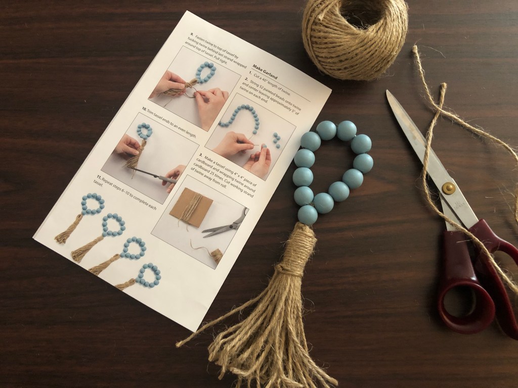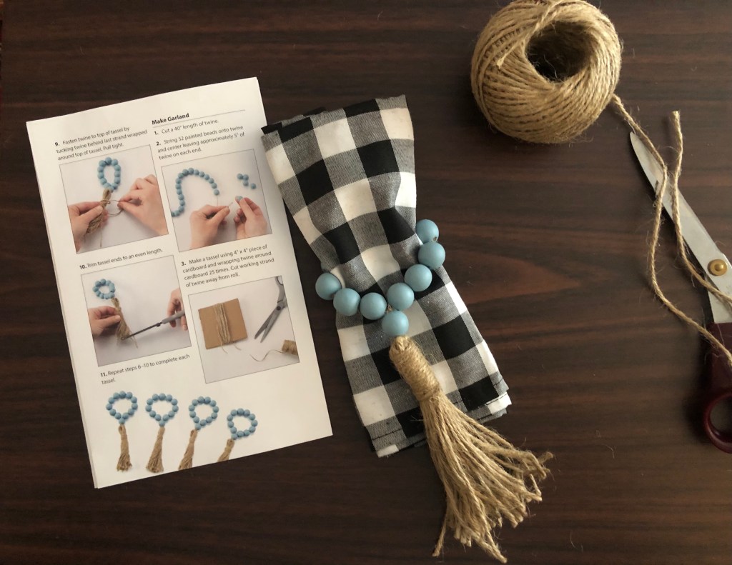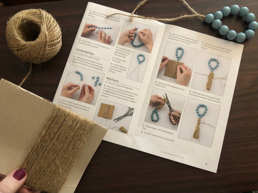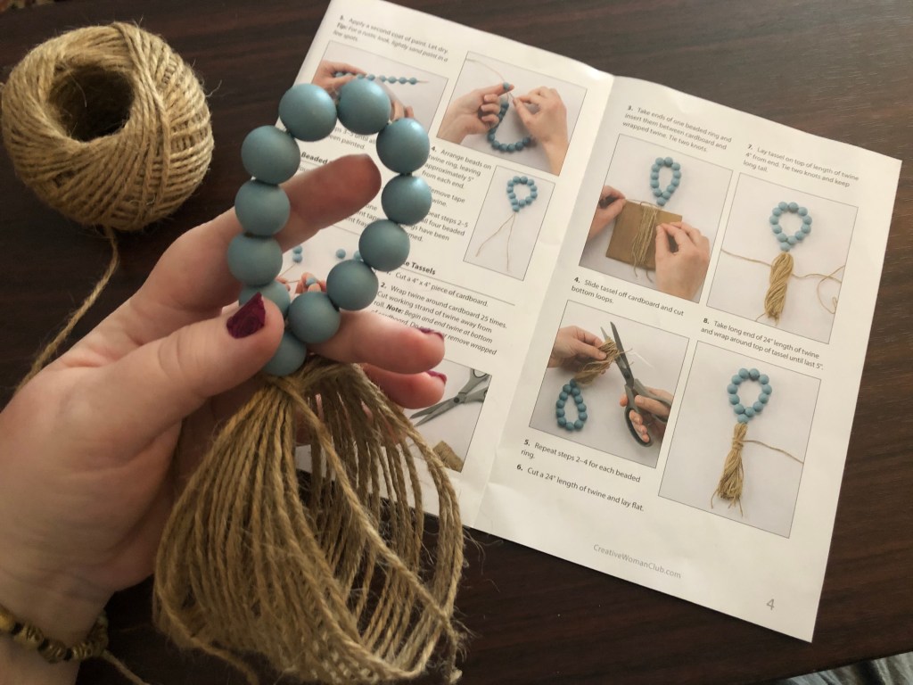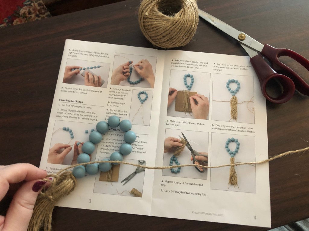 Next I began to wrestle with the twine like it was a living thing. The directions said cut two feet of twine and then wrap it around the tassel and tie two knots. Then I was supposed to wrap the twine around the tassel and tie it with another knot, but this time there was some convoluted direction to stick the end of the twine through the wrapped part. Which I couldn’t do because I had pulled it so tight I don’t think it would have come undone for any reason. But it said make a knot, so I did. No life lesson here, just frustration because, to be honest, I should have read the directions through completely in order to refresh my memory. Trying to slide twine into a tight space is just never going to go well. Come to think of it, I might have just found the one thing MacGyver wouldn’t have found useful.