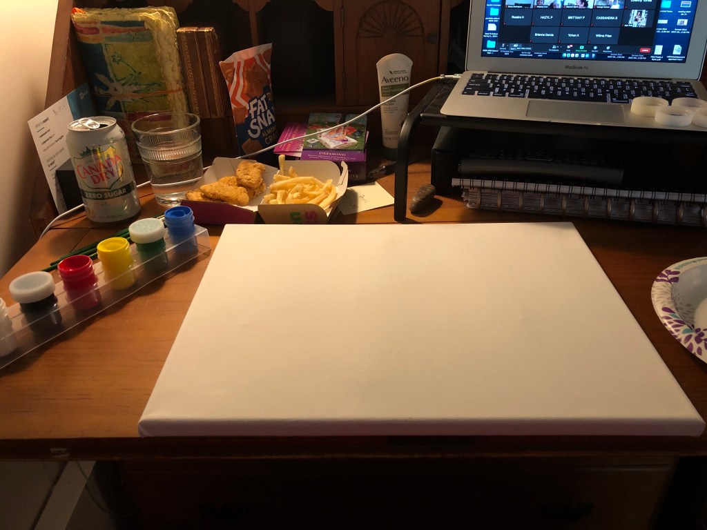 My first problem is that I couldn’t find a place where I could easily with my computer and the canvas and everything else but with some finagling I made that work. However, it took me a little longer than I thought it would, so it was a little bit of a mess and I was a little unprepared to actually start. And yes, I did eat chicken nuggets for dinner…lol