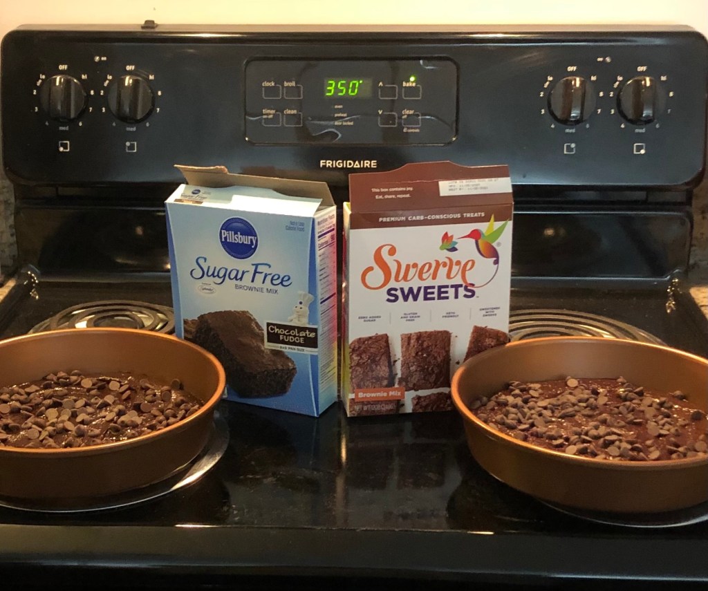 Since that gave me no time to enjoy the flavor, but I know that about myself, which is why I cut a small piece, I cut another small piece and this time I tried to slow down enough to savor it. When I really let myself taste them, I knew it was no contest. The Swerve, as much as I love them for trying, was a no go. It tasted ever so slightly bitter and had an aftertaste. The Pillsbury was actually pretty good, still not the perfect brownie, but I also realized after I had taken them out of the oven that I need to try a different sugar free chocolate chip to give the mix a fair chance to take top place. Next time I’m at the sugar free bakery, Chatila’s in Salem NH, I’ll pick up a container of their sugar free chocolate chips and try another box of Pillsbury.